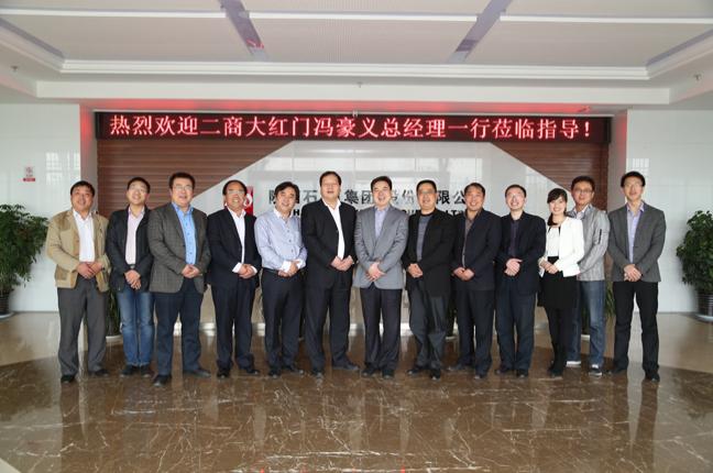 4月4日12時北京二商集團大紅門肉類食品有限公司總經理馮豪義、蒲城大紅門公司總經理薛克來等一行五人蒞臨石羊集團總部參觀交流,集團總裁常青山、副總裁韓春元、油脂事業(yè)部總經理孔紅民等有關領導接見會談。