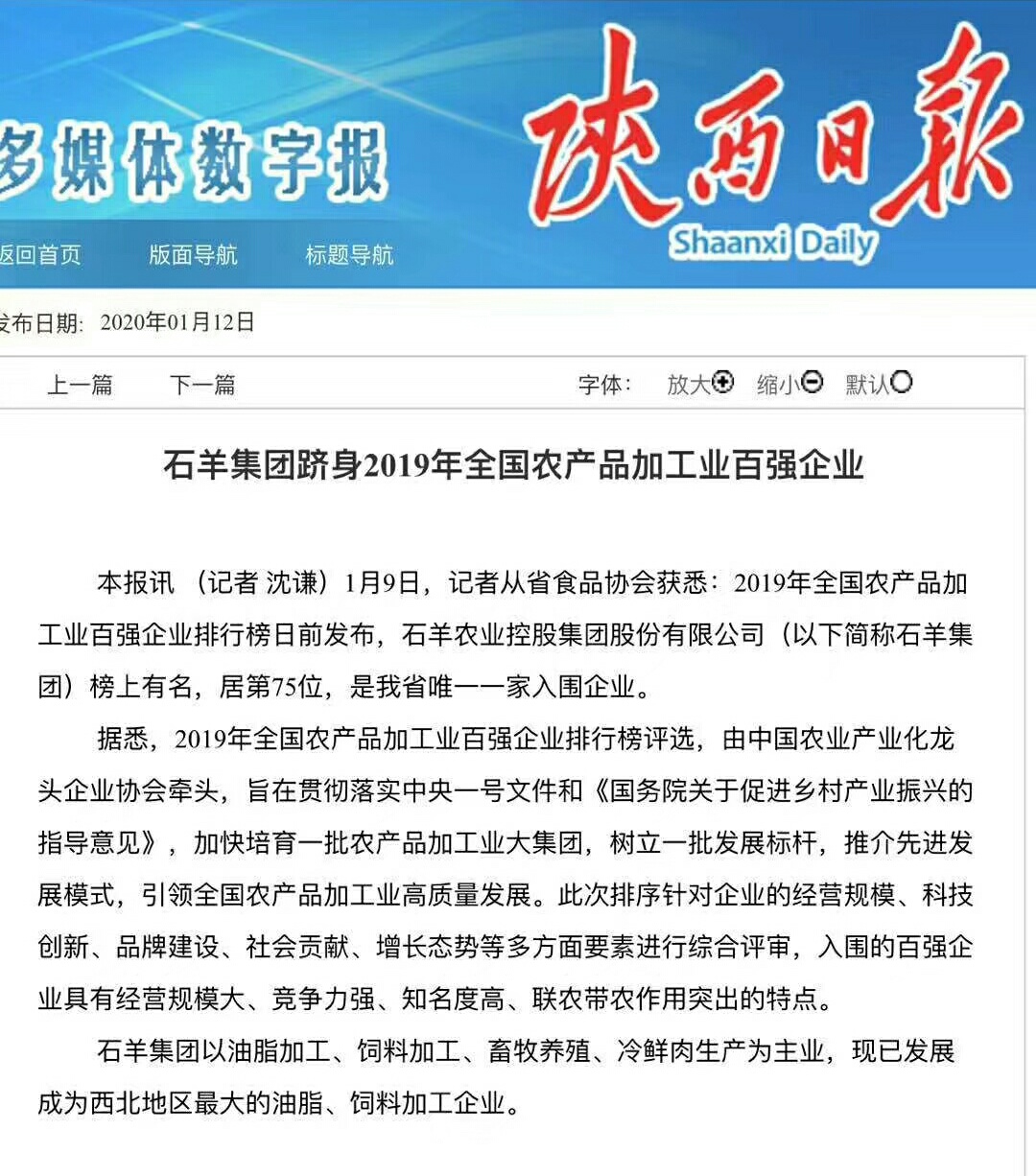 日前,中國農(nóng)業(yè)產(chǎn)業(yè)化龍頭企業(yè)協(xié)會發(fā)布2019年全國農(nóng)產(chǎn)品加工業(yè)百強企業(yè)名單,石羊農(nóng)業(yè)控股集團股份有限公司(以下簡稱石羊集團)榜上有名,居第75位,是陜西省唯一一家入圍企業(yè)。