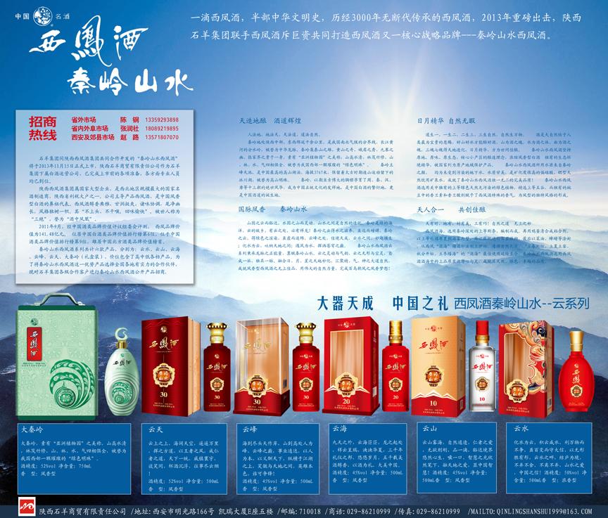 秦嶺山水西鳳酒系列共計(jì)六款產(chǎn)品,分別為:云水、云山、云海、云峰、云天、大秦嶺(禮盒裝),價(jià)位包含了高中低各檔產(chǎn)品。為了將秦嶺山水西鳳酒這一優(yōu)勢(shì)產(chǎn)品選擇全國(guó)各地有實(shí)力的合作伙伴,現(xiàn)對(duì)石羊集團(tuán)各級(jí)合作客戶進(jìn)行秦嶺山水西鳳酒公開(kāi)產(chǎn)品招商,各地有合作意向客戶可聯(lián)系石羊商貿(mào)公司以下相關(guān)人員。