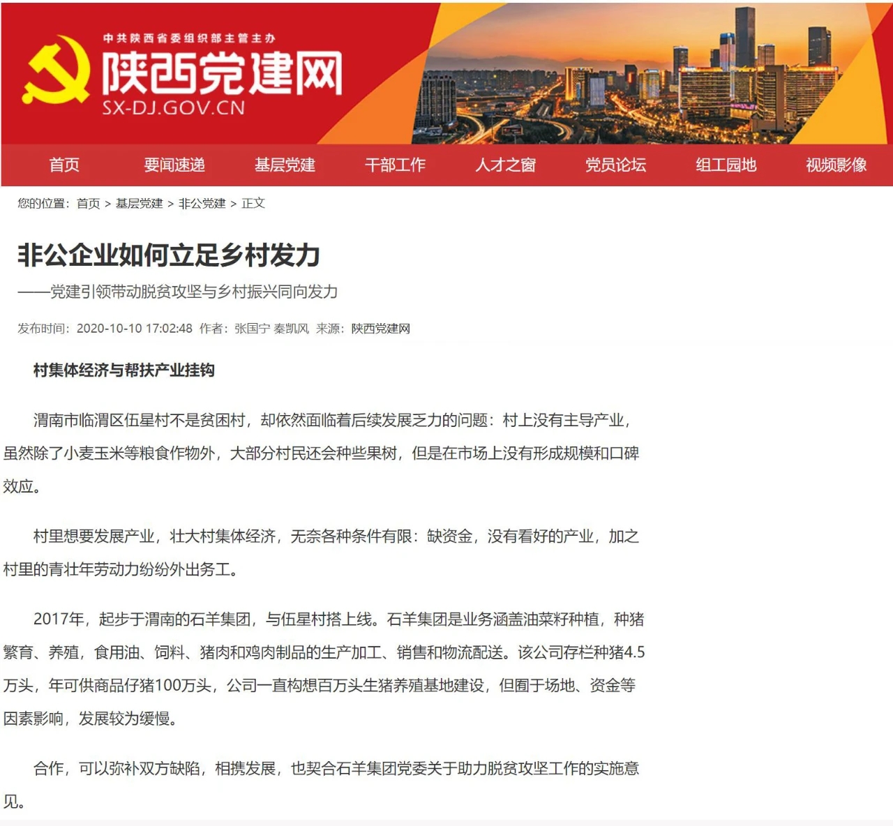 10月11日,陜西黨建網(wǎng)刊登題為《非公企業(yè)如何立足鄉(xiāng)村發(fā)力——黨建引領帶動脫貧攻堅與鄉(xiāng)村振興同向發(fā)力》報道。
